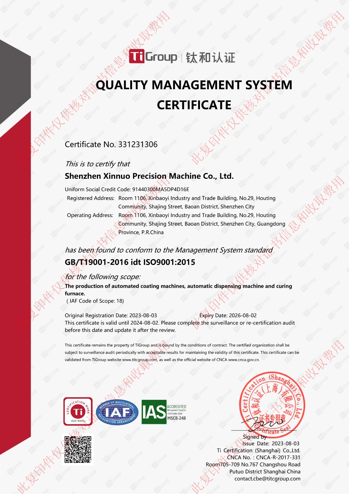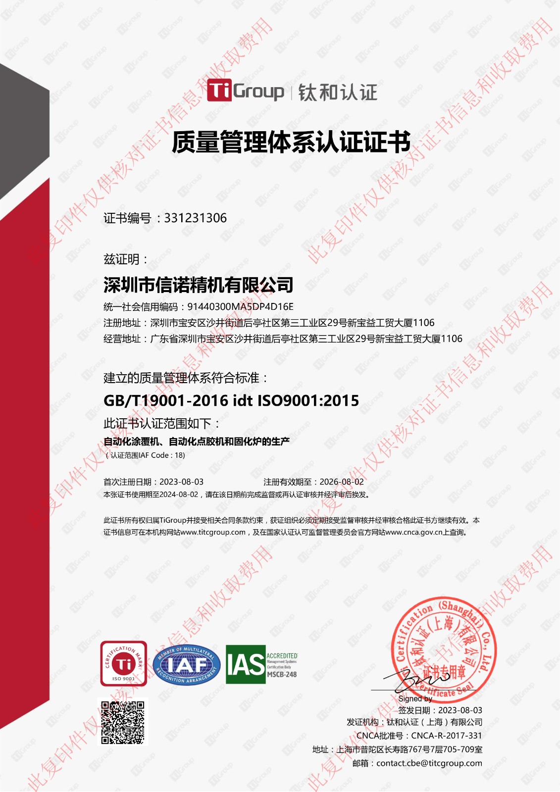 2023年8月信諾榮獲質(zhì)量管理體系認(rèn)證證書(shū)