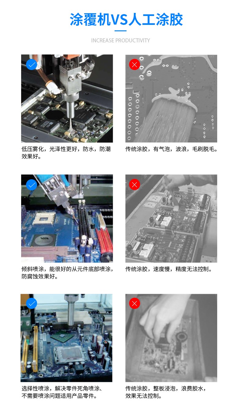 高效率:自動涂覆,自動固化,流水線作業(yè),大大提高了產(chǎn)能。